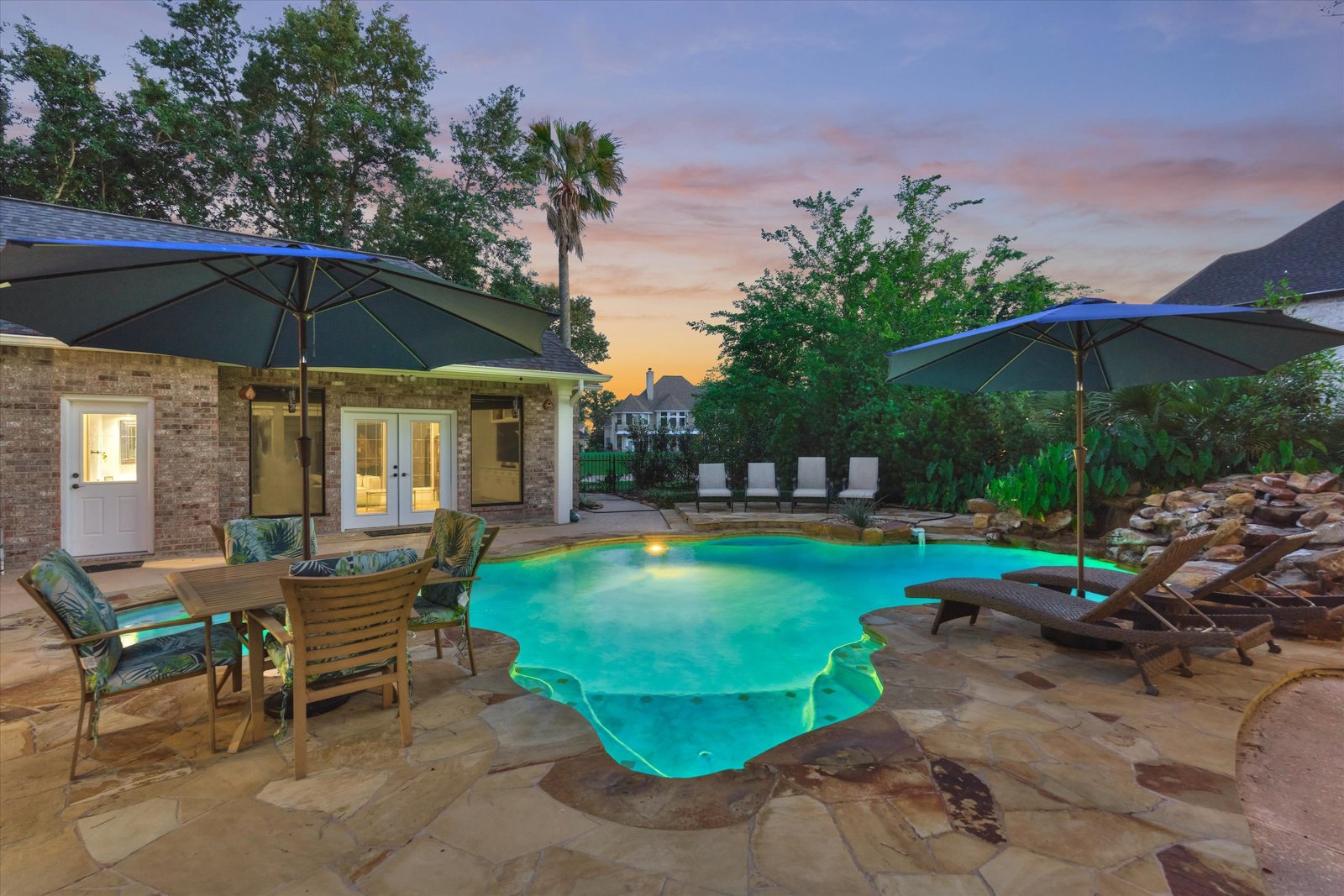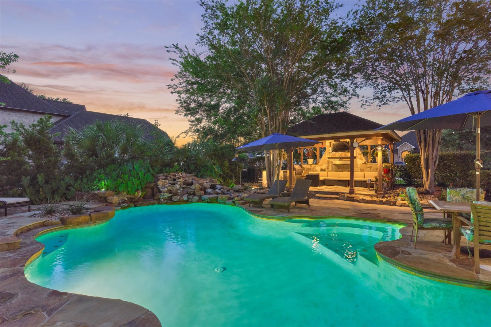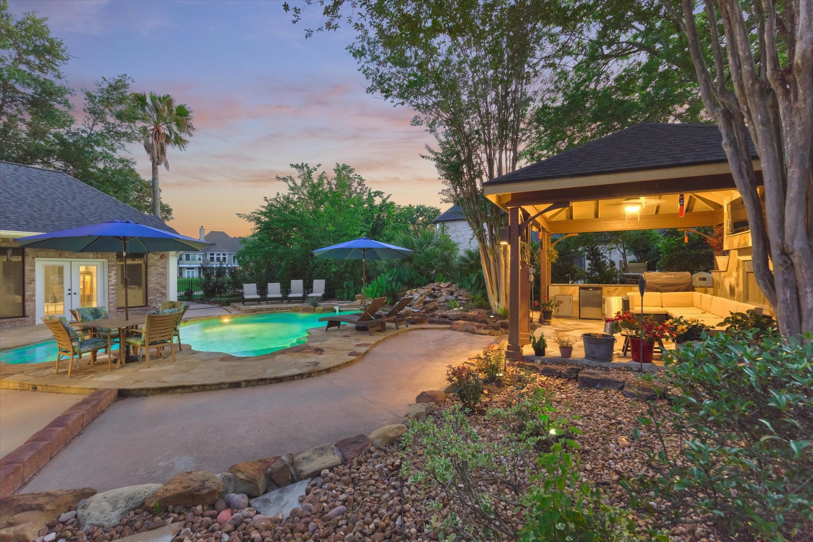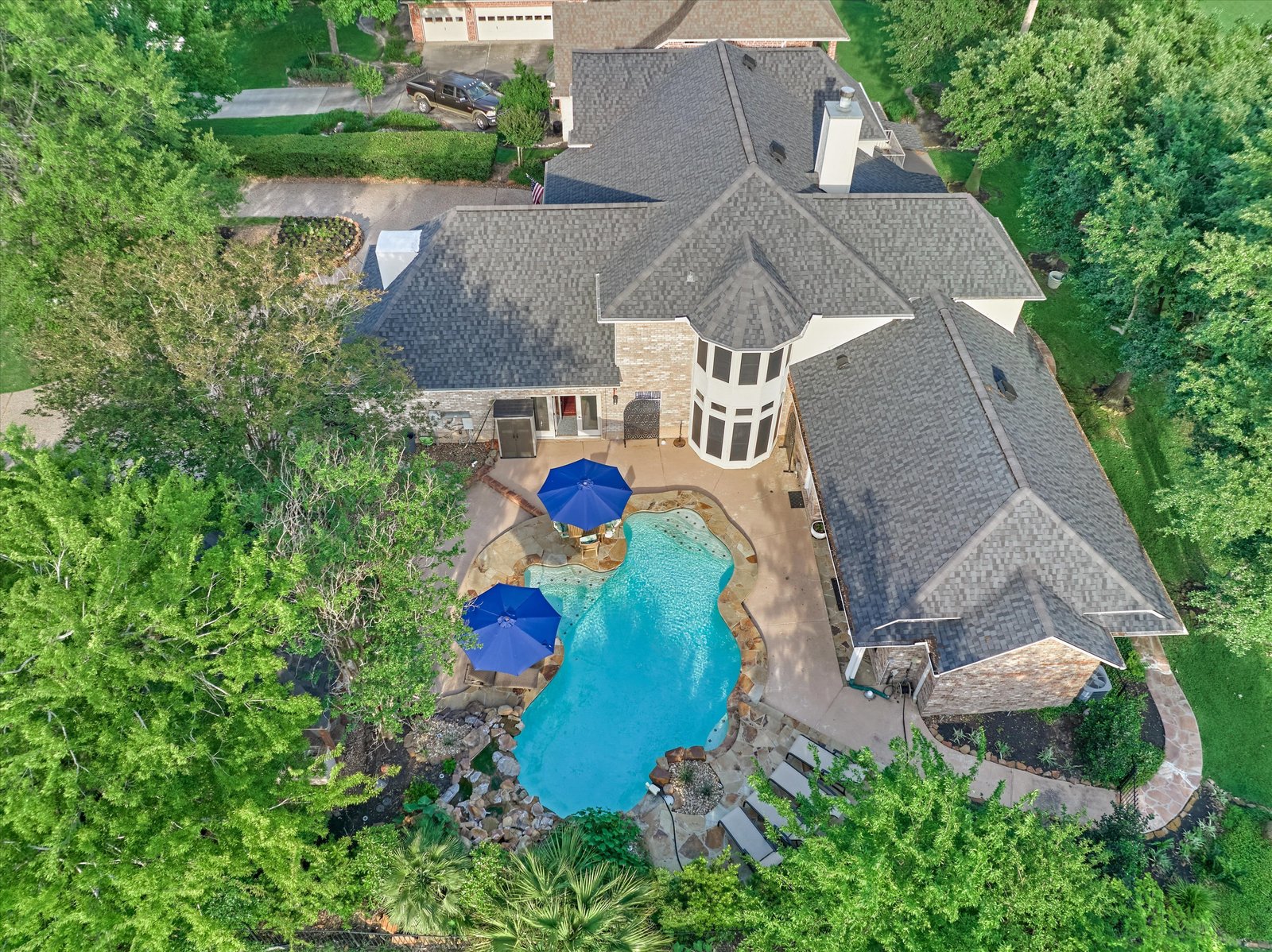 Stunning home in the prestigious Bentwater Country Club, ideally positioned along the 12th hole of the Weiskopf golf course. This elegant residence features five bedrooms, five full and one half baths, two car plus golf cart garage and a variety of spacious living and flexible-use areas, perfect for both everyday comfort and exceptional entertaining. Sophisticated finishes and timeless design elements flow throughout, including newer engineered wood flooring, solar screens, a security system and first floor game room. A dedicated home office with full bath, sunroom, and screened-in patio offer unique interior highlights. Enjoy outdoor living with a sparkling chlorine pool, expansive decking, and a large covered cabana complete with a full outdoor kitchen and fireplace. Upstairs, four guest bedrooms, two full baths, and a private balcony provide ample space for family and visitors alike. A truly remarkable home in one of Lake Conroe’s premier communities.
